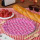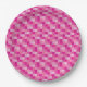 Diese Partypapierplatte kennzeichnet Quadrate in den verschiedenen Schatten des Rosas in einem pixelated Muster, das 16 Bitgraphiken in den populären Videospielen ähnelt.