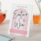 Retro rosa Raffle Schild mit trendigen Schriftart, hellrosa Bogen Hintergrund. Benutzen Sie dieses mädchenhafte "Enter to win"-Tischschild für Ihren nächsten Corporate- oder Privatpreis-zeichn, egal ob es sich um eine Verlosung oder ein Babyduschspiel handelt. Dieses Podestschild kann jede Verlosung Anzug machen!