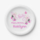 Geburtstags-Party-Teller, der eine Illustration eines Paares Rollen-Skate mit rosa Rädern, Schnüren und Sternen kennzeichnet.