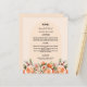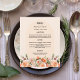 Für eine elegante und romantische Hochzeit. Ein zarter, pfirsichfarbener Hintergrund mit orangen, pfirsichfarbenen und rosa Blumen. Bogenförmiger Rahmen Personalisieren Sie Ihre Namen und Details und fügen Sie diese hinzu. Zurück: pfirsichfarben. 1 Blatt = 1 Menü, mit dem die Kante an Kante aufgedruckt ist.