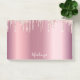 Dekoriert mit Rose Gold Imitate Glitzer Tropfen, Farbe Tropfen aussehen. Eleganter rosafarbener Imitat mit metallischem Hintergrund. Template für Ihren Namen in Weiß geschrieben mit einem handgeschriebenen Stil Skript.