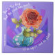 Eine farbenfrohe, blumengeschmückte Kachel mit bemalten Blume; eine rosa Rosenblüte in einer Wasservase, auf einem Rückenspeck von lila. Um die Blume geschrieben ist der Vers aus Psalm 118:24. "Dies ist der Tag, den der Herr gemacht hat, lass uns Freude und sei froh!" Perfektes Accessoire, um Ihrer Küche (oder einem anderen Zimmer im Haus!) eine Touch Segen und einen Farbtupfer hinzuzufügen.