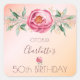 Ein romantischer Aufkleber für eine 50. Geburtstagsparty (oder jedes Alter). Eine Rose Gold und rot rosa Farbverlauf Hintergrund. Große, rosa Rose, grüne Blätter, Blattwerk mit kleinen goldenen Blume. Personalisieren und fügen Sie ein Datum, Name und Alter 50. Dunkle Rose goldfarbene Buchstaben. Der Name ist mit einem modernen handgeschriebenen Stilskript geschrieben.