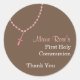 Dieses zeitgenössische Rundaufkleber-Design mit Communion besticht durch einen rosa Rosar auf einem Schokoladenhintergrund. Personalisieren Sie diesen Aufkleber mit Ihren eigenen Angaben und Formulierungen. Graphic by Jessicaweible.com