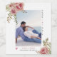 Rose rosa Aquarellfarben-Blume, grüne Blätter und Foto Save the Date Foto Flaschenetikett. Ein schönes Design, das ein Foto, Kakteen-Blume und sukkulente Blätter in den oberen links und unteren rechten Ecken zeigt, den Text "Save the Date" und ein Herz.