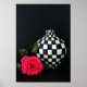 Ein Stillleben-Design mit schwarzem Hintergrund mit einer rosa Rose neben einer schwarz-weiß karierten Vase.