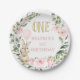 Rosa Rosen Bunny Turning Ein 1. Geburtstag Papier Platte Sweet Kaninchen Hasen erste Geburtstagspapiere Platte für ein kleines Mädchen mit einem sonnigen, rosa Ballon und einem Laub Kranz mit rosa Rosen. Ideal für eine Mädchen zum ersten Geburtstag, sonnige Geburtstagsparty.