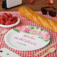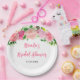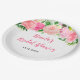 Dieser schöne und elegante Teller zeigt Aquarell-Rosen und Laubwerk in Rosa. Der Text kombiniert handgeschriebene Schrift und Serifenschriften für einen stilvollen und modernen Look. Dies ist perfekt für eine rustikale Brautschau im Frühling oder Sommer.