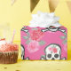 Ein lustiges, cooles und modernes Design eines weißen Schädels und Kreuzknochen mit zwei blühenden rosa Rosen auf der Stirn und den gleichen Rose, die mit grünen Blätter als ein sich wiederholendes Muster im Hintergrund. Die rosa Unterlage kann in eine beliebige Farbe geändert werden.