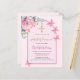 Rosa Hintergrundfarbe mit einem Bogen. Die Einrichtung besteht aus rosa Blumen, Blume der Rose, grünem Eukalyptusgrün und Schmetterlingen. Personalisieren und fügen Sie einen Namen und Details. Zurück: Rosa Hintergrundfarbe rot. 1 Blatt = 1 Einladung mit Druckkante bis Kante.
