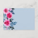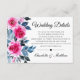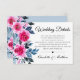 Elegantes Hochzeitsdetails Gehäuse-Kartendesign mit hellrosa Aquarellfarben, blauem und grauem Blattwerk auf weißem Hintergrund. Die Rückseite der Einladung ist in staubblauer Farbe.