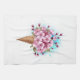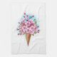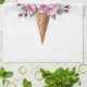 Süßer Waffelkonus mit frischen, rosafarbenen japanischen Kirschblüten auf weißem Hintergrund mit blauen Wasserfarben. Rosa japanische Kirsche.