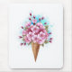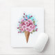 Süßer Waffelkonus mit frischen, rosafarbenen japanischen Kirschblüten auf weißem Hintergrund mit blauen Wasserfarben. Rosa japanische Kirsche.