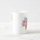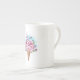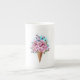 Süßer Waffelkonus mit frischen, rosafarbenen japanischen Kirschblüten auf weißem Hintergrund mit blauen Wasserfarben. Rosa japanische Kirsche.
