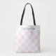 Diese Tasche hat ein hübsches Muster aus rosa gemalten Quadraten und einfachen weißen Quadraten, die in einem Schachbrettmuster angeordnet sind. Oben auf der Tasche ist Platz, um einen Namen oder eine eigene Nachricht in schwarzer Schreibschrift hinzuzufügen.