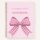 Ein mädchenhaftes Notizbuch für Schule, Journalismus oder Tagebuch. Ein weicher, rosafarbener Hintergrund, der mit einem großen, karierten Bogen geschmückt ist. Personalisieren und einen Namen hinzufügen.