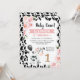 Rosa Schwarz Heilige Kuh Blütenkuh Print 1. Geburtstag Einladung Niedliche Kuh Thema erste Geburtstagseinladung für ein kleines Mädchen mit einer niedlichen schwarz-weiß Kuh, ein kühnen Kuh Print Muster, rosa Banner und einige schöne rosa blühende Rose. Die rosa, blumengeschmückte heilige Kuh und die schwarze Kuh laden zum ersten Geburtstag zu einer Kuh-Geburtstagsfeier ein.