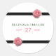 Dieses Design besticht durch elegante rosa Blume. Die blorrosa Rosen in Verbindung mit dem eleganten schwarzen Farbbandbild schaffen einen raffinierten, einfachen Rahmen, der die Formulierung prägt. Die rosa Farbtöne der Blume der Rose kontrastieren mit dem schwarzen Band und der Formulierung, die einen eleganten Stil schaffen. Elegantes Hochzeitsaufkleber-Design mit modernen Elementen. Auch die passenden Hochzeitseinladungen und andere Schreibwaren sind verfügbar.
