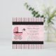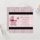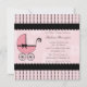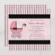 Diese 5,25x5,25 Babydusche ist mit einem schwarz-rosa gestrichelten Streifen auf der Oberseite und unten. Es gibt einen schwarzen Skallopierschnitt über und unter Ihren anpassbaren Informationen in der Mitte. Es sind verblasste Blume und ein niedlicher Babyroller in der Mitte.
