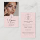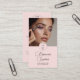 Minimale Businesskarte mit rosa, schwarzer und weißer Schrift und vertikalem Foto-Make-up.