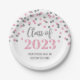 Individuell anpassbare Graduierungsparty-Klasse von 2023 Tellern in glamourösem silber-rosa Konfetti-Muster und eleganten handgeschriebenen Stil Text.