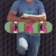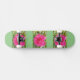 Ein Skate mit 3 Bildern einer rosa Rose auf der Vorderseite und auf der Rückseite, mit einem grünen Hintergrund.
