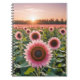 Ein lebendiges Feld rosa Sonnenblumen erhebt sich vor dem Hintergrund einer untergehenden Sonne, die ein warmes Licht über die Blüten und Blätter wirft