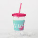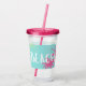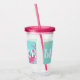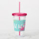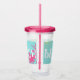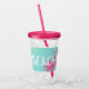 Weiße und rosa Trommel mit Strandgrafik. Aquamariner Hintergrund mit der Sonne und rosa Palmen mit Strand in weißem Text. Grafische Vorführungen auf der Vorder- und Rückseite des Schüttelers. Farbenvielfalt für Deckel und Stroh.