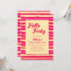 Diese farbenfrohe und lustige Geburtstagseinladung enthält ein nahtloses Muster mit rosa, roten, orangefarbenen und pfirsichfarbenen Streifen.