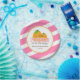 Moderner kleiner Kürbismädchen-Babyduschen-Papier-Teller. Aufmachung der diagonalen rosa und weißen Streifen, der ImitatgoldGlittergrenze und der orange Watercolorkürbise.