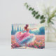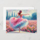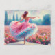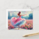Dieses Bild zeigt eine Frau, die auf einem Bein auf einer Holzplattform inmitten eines Feldes mit rosa Blume stehend ist. Die Frau trägt ein üppiges rosa Kleid, das mit Rose-ähnlichen Blume geschmückt ist und sich wunderbar mit der umliegenden Flora vermischt. Der Hintergrund ist mit hohen, schlanken Bäumen bepflanzt und in sanftem, diffusem Licht gebadet, was der Szene eine ätherische Qualität verleiht.