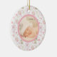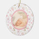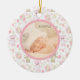 Hier ist ein niedliches Foto-Template für kleine Mädchen, das zu Weihnachten oder zu jeder Zeit im Jahr zum Zeitpunkt der Geburt des Babys gegeben werden kann. Die Vorderseite zeigt ein eigenes Foto in einem runden Rahmen. Der Rahmen ist mit einem zauberhaften Teddybär und Ballonbildern gefüllt, mit einem inneren Liner aus Rosa. Die Rückseite des Ornaments hat den gleichen Rahmen mit weißem Interieur und zwei benutzerdefinierte Textfelder.