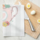Ein Küchentuch mit einer skurrilen Abbildung. Ein rosa Teekessel mit einem kleinen rosa Herz in der Mitte und ein Strauß mit Blume im Inneren. Feine, pastellfarbene Schmetterlinge flattern herum. Set auf grauem und weißem Streifen.