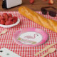 Hübsche rosa Flamingo- und Palmenwedel entwerfen für Ihr tropisches themed Geburtstags-Party. Ausrüstungsbeschreibungen ein rosa Aquarellhintergrund. In der Mitte ist ein weißer Kreis mit hellgrauer Ordnung. Mitten in dem Kreis ist ein großer rosa Flamingo unter dem Flamingo ist eine rosa Fahne mit einem Palmwedel an jedem Ende. Zwischen den Palmen ist Text im tadellosen grünen Schriftart, der Aloha sagt und es gibt kundengerechten Text im gleichen tadellosen grünen Schriftart, in dem Sie den Geburtstagsgast des Alters der Ehre hinzufügen können.