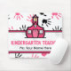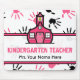 Ein Kindergärtnerin mousepad, das einen Hintergrund der rosa und schwarzen handprints über Weiß kennzeichnet. Rosa Schulhauslogo in der Mitte. Text liest "KINDERGÄRTNERIN." Personifizieren Sie mit Ihrem Namen. Look for zusammenpassende Einzelteile am rosa Schulhaus.