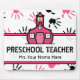 Ein Vorschullehrer mousepad, das einen Hintergrund der rosa und schwarzen handprints über Weiß kennzeichnet.  Rosa Schulhauslogo in der Mitte.  Text liest "VORSCHULlehrer."  Personifizieren Sie mit Ihrem Namen.  Look for zusammenpassende Einzelteile am rosa Schulhaus.