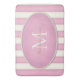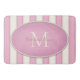 Diese individuelle Badmatte hat ein helles Elfenbeinmonogramm in einem ovalen Rahmen auf einem Hintergrund von breiten Streifen in Rose pink und antiken Weiß.