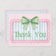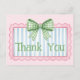 Diese niedliche Dankes-Postkarte zeigt einen rosa Rahmen mit blau-weißen Streifen und wird mit einer schicken grün-weißen Gingham-Karo-Schleife gekrönt. Personalisieren Sie mit Ihrer Wahl des speziellen Textes.