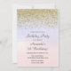 Geburtstagseinladung mit goldenem Glitzer-Design und ombre pink und blau Aquarell Hintergrund.