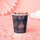 Rosa und dunkelblaue Formen sind ein schönes AI-Kunst-Design, das rosa Spitzenformen auf dunkelblauem Hintergrund zeigt. Sie sind die perfekten Pappbecher, um Ihre Gäste zu beeindrucken