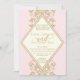 Rosa und goldfarbener Damast Vintage Glam Hochzeitsinspektion Set mit goldenem Damast und eleganten ivory Diamond Center Box. Inspiriert durch Vintages barocke Blumendesign, ist diese hübsche Rosa- und Goldhochzeit-Einladung direkt am Trend mit den elegantesten modernen Sets der Jahrgangszeit mit ihrem kühnen, skurrilen Schriftzeichen und dem schönen formalen Stil.