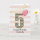 Eine rosa und goldene 5. Geburtstagskarte für Mädchen, die Sie mit ihrem Namen personalisieren können. Die Vorderseite dieser schönen 5. Geburtstagskarte für sie zeigt die Nummer fünf in einem Schwarz-Weiß-Streifen mit einer Kontur Glitzer mit einem rosa Ballon bereit zum Float. Bitte beachten Sie, dass der Gold-Glitzer ein Designeffekt ist und kein Glitzer auf dieser Geburtstagskarte vorhanden ist. Der Hintergrund ist ein weiches Weiß und Rosa mit einem goldfarbenen Banner oben.Die innere Nachricht kann leicht personalisiert werden, wenn Sie gewollt. Ein hübscher 5. Geburtstagskarte-Sake für sie.
