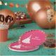 Hübsche Papiertafel aus rosa Brautparty, mit goldfarbenem Akzent, um die Kanten. Die Grafik einer Braut schmückt die Mitte des Tellers zusammen mit dem weißen Text, der auf die individuelle Gestaltung vorbereitet ist.