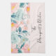 Ein Küchentuch mit elegantem Blumenrahmen. Blume und Blätter in Rosa und Grün.
