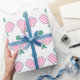 Dieses Geburtstagsverpackungspapier enthält ein Muster von Paddeln aus Pickleball. Die Farben sind rosa und grün.