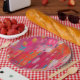 Feines abstraktes Gemälde in Rosa- und Orangetönen.