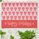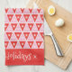 Ein stilvolles und lustiges Weihnachtsküchenhandtuchdesign mit retroinspiriert geometrischen Dreiecken. Dieses lustige Weihnachtsgeschenk kann mit einem Namen, einer Phrase, einem Monogramm oder einer eigenen Nachricht personalisiert werden. Die Farben sind grün, rot, weiß, blau und rosa.