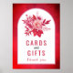 Rosa und rote Blume und Botanische Kunsthandwerkskarten und Geschenke Hochzeitsposter. Ein schönes Hochzeitsdesign, das einen Bogenrahmen auf rotem, farbigem Hintergrund zeigt. Im Rahmen befindet sich Ihr Text und ein Strauß mit dalia Blume und Blätter in Rosa und Rot.