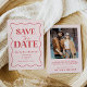 Pink und Red Wave Wedding Save The Date Postcard Einfache Retro-rosa rote Postkarte Save the Date Postkarte mit einem skallopierten roten Rahmen auf einem rosa Hintergrund und einer Vintagen Kalligraphie-Titel. Das Paarfoto erscheint auf der Rückseite zusammen mit einer Nachricht und Details.