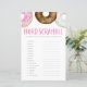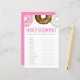 Fügen Sie diese lustige Baby Wort Ramming Spielkarte zu Ihrer Babydusche hinzu. Diese Babyduschkarte bietet Aquarellpinken, weiße und schokoladenfarbene Donuts mit bunten Sprinklen. Personalisieren durch Hinzufügen von Namen, Ereignis und Datum. Dieses Aquarell-Baby Duschspiel ist perfekt geeignet für ein Girl-Baby-Duschen.